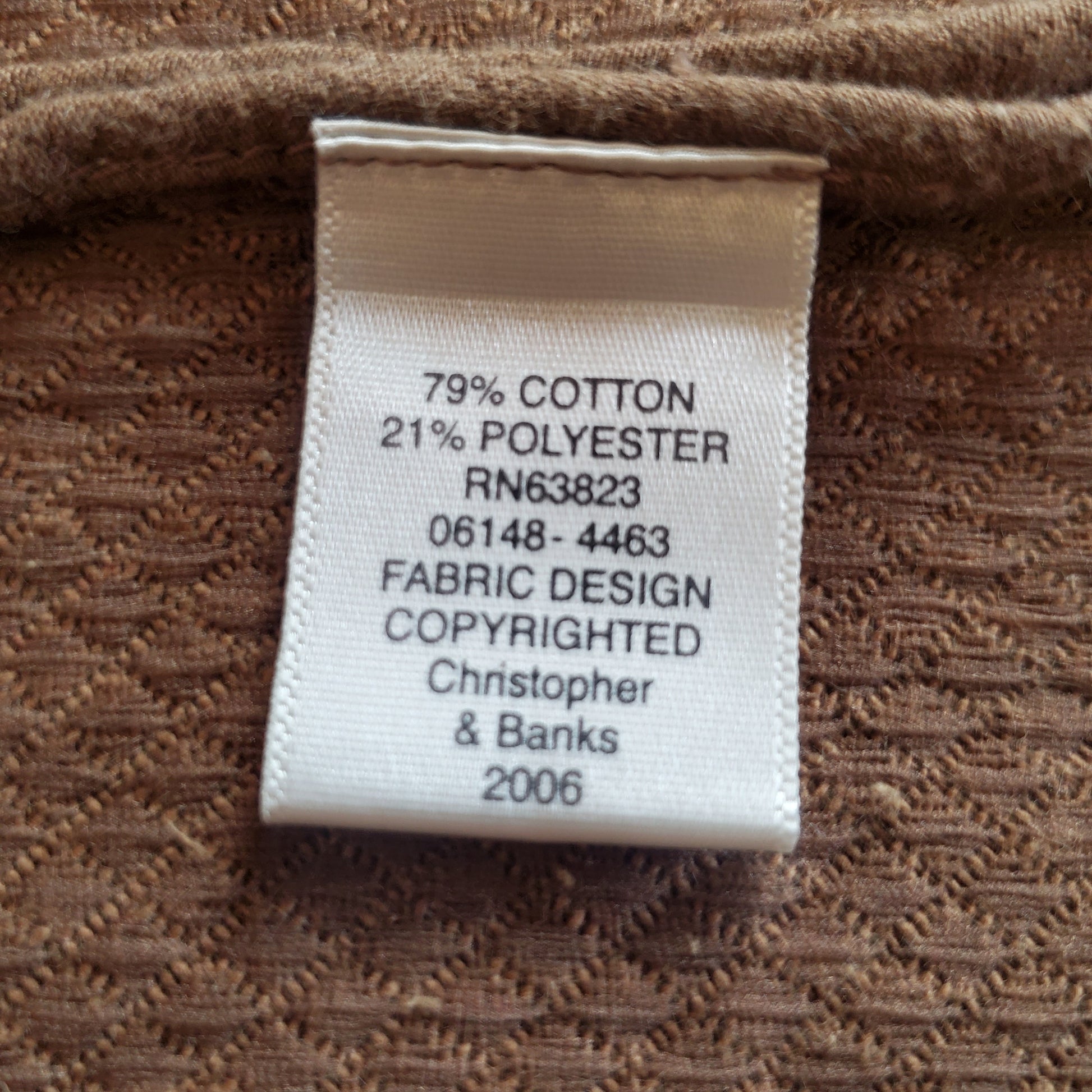 This size medium Christopher & Banks Y2K button up best is from 2006. It's a textured dark brown fabric (cotton & polyester blend). The vest has paneling.