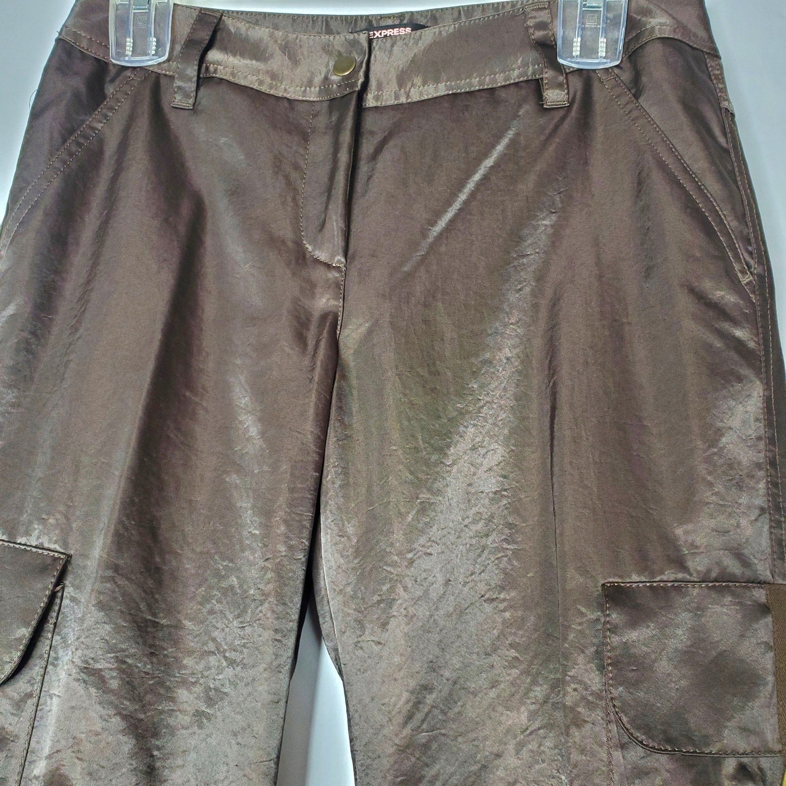 Express satin brown pants w/ cargo pockets, floral embroidery mid-ride W30 L31
