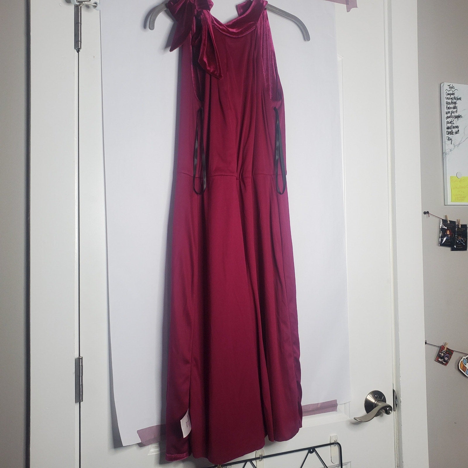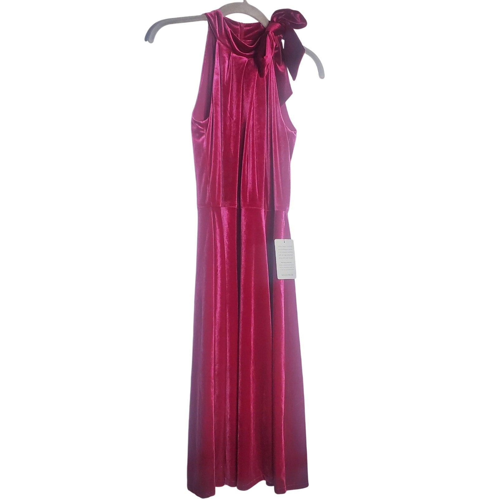 This Maggy London Emelia cocktail dress features a halter neck and a midi-length skirt. The fit is flattering with some stretch. The dress is of great quality with a lining. The velvet fuchsia is attention-grabbing and gorgeous—bow detail at the neck.