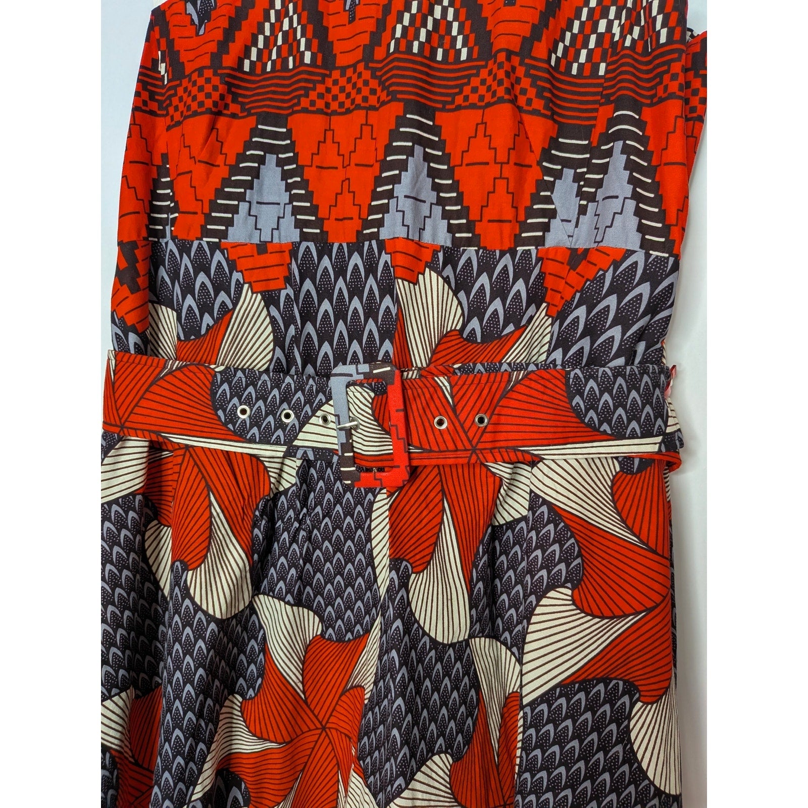 This maxi dress (with optional belt) features a crisp white collared top that transitions into a bold African inspired red, white, and blue geometric design. Where the print pattern starts is a wider portion of the dress that then flows out and down.
