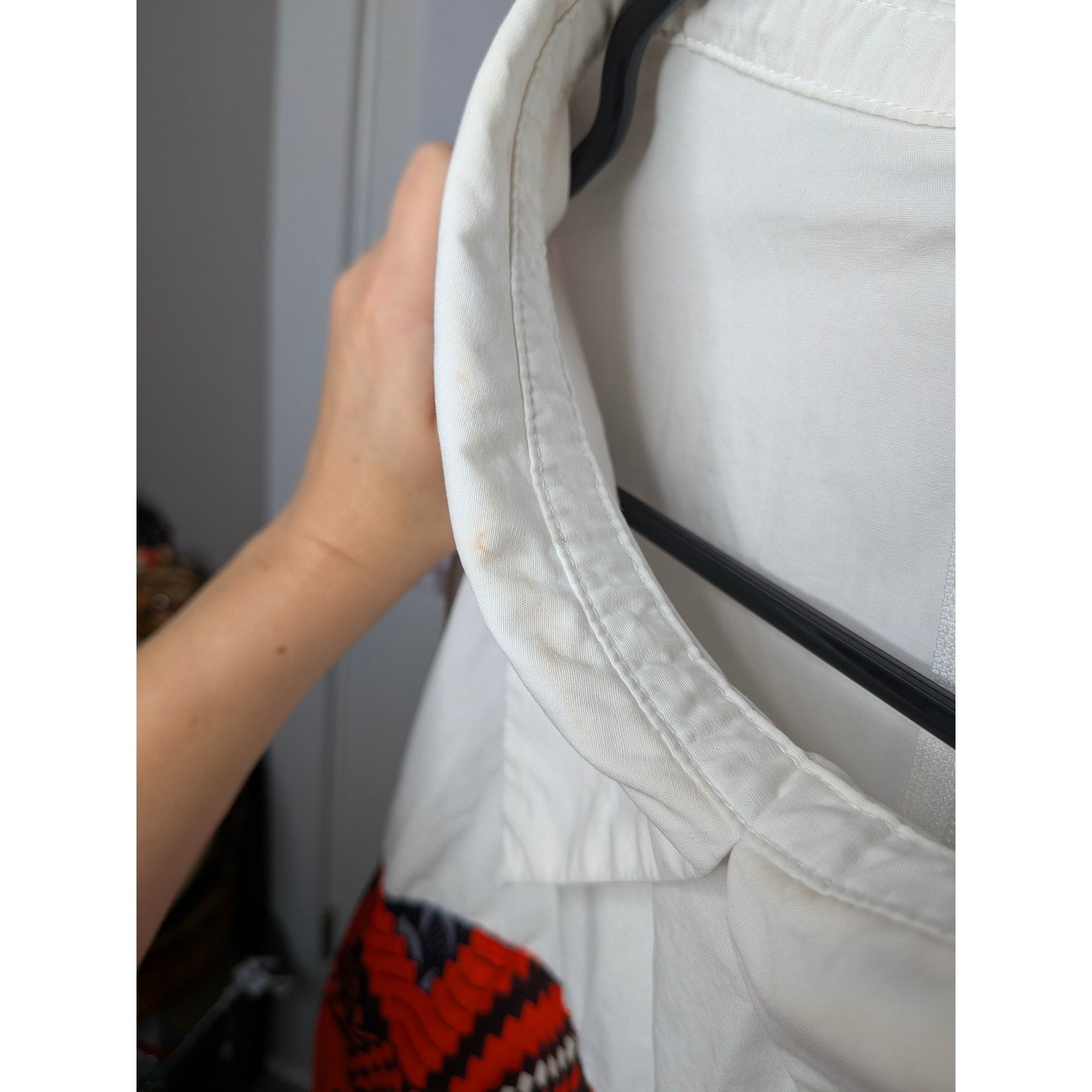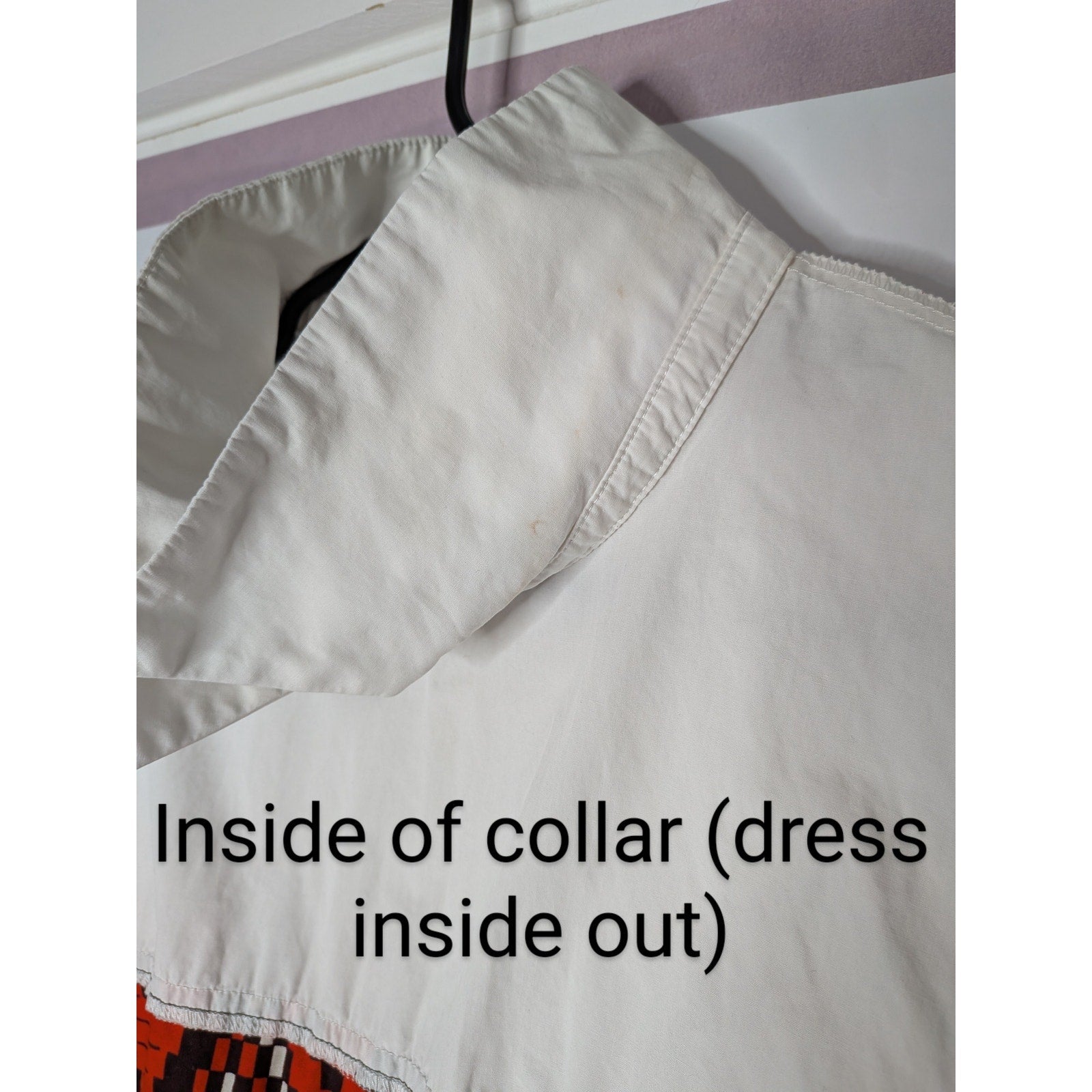 It has small makeup stains inside the collar and on the edge of the collar (see last 4 photos). They aren't noticeable when wearing the dress. The belt buckle is a bit strange, it is fine when closed and worn but seems loose when hanging (I'm not positive if this is a flaw or how it is supposed to be. Let me know if you want any additional pictures or have questions.