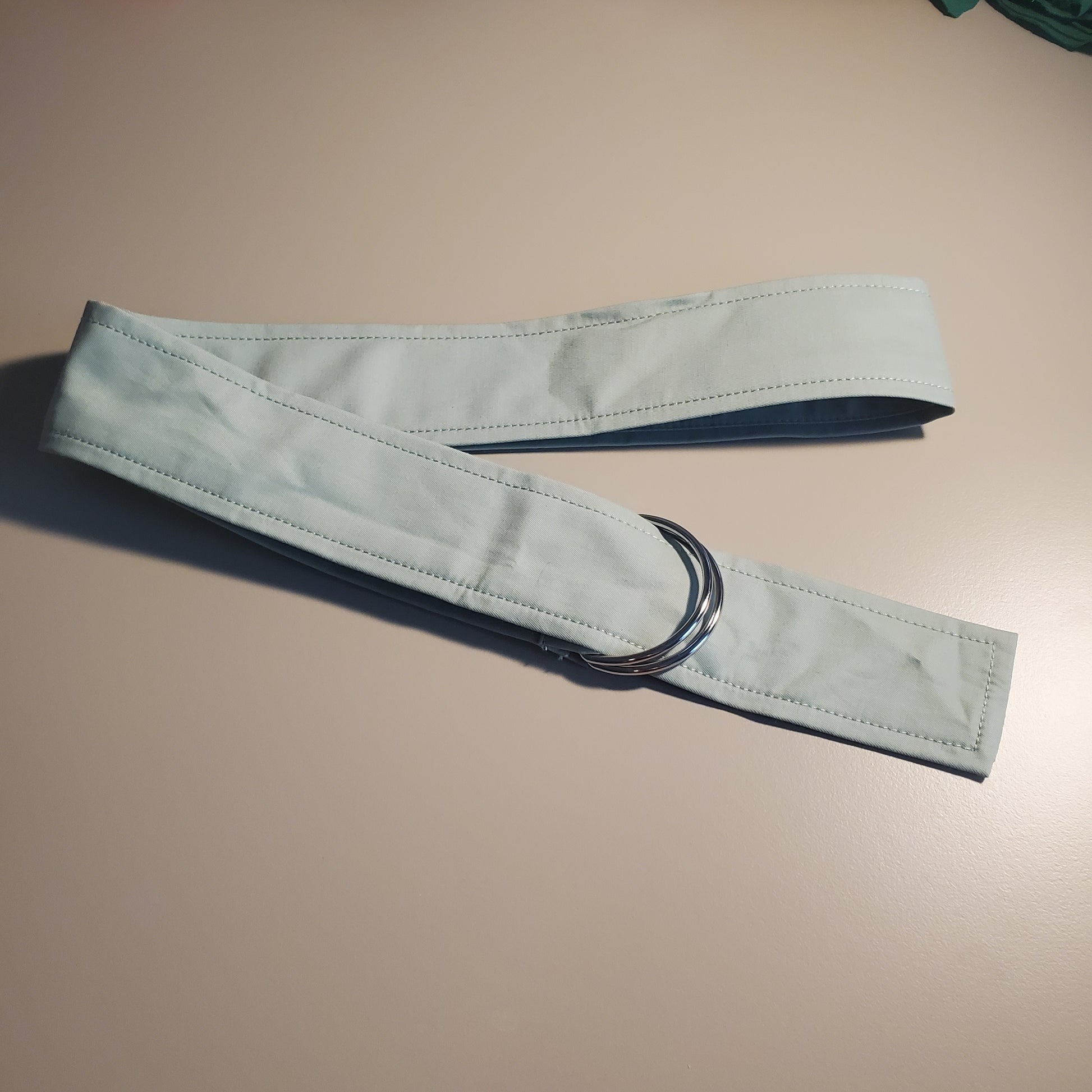 They come with a belt. The pants are a cotton and nylon mix. They have a bit of stretch. Machine wash is fine but they recommend line drying. The back pockets are still sealed so don't forget to open them. The pockets are decently sized!